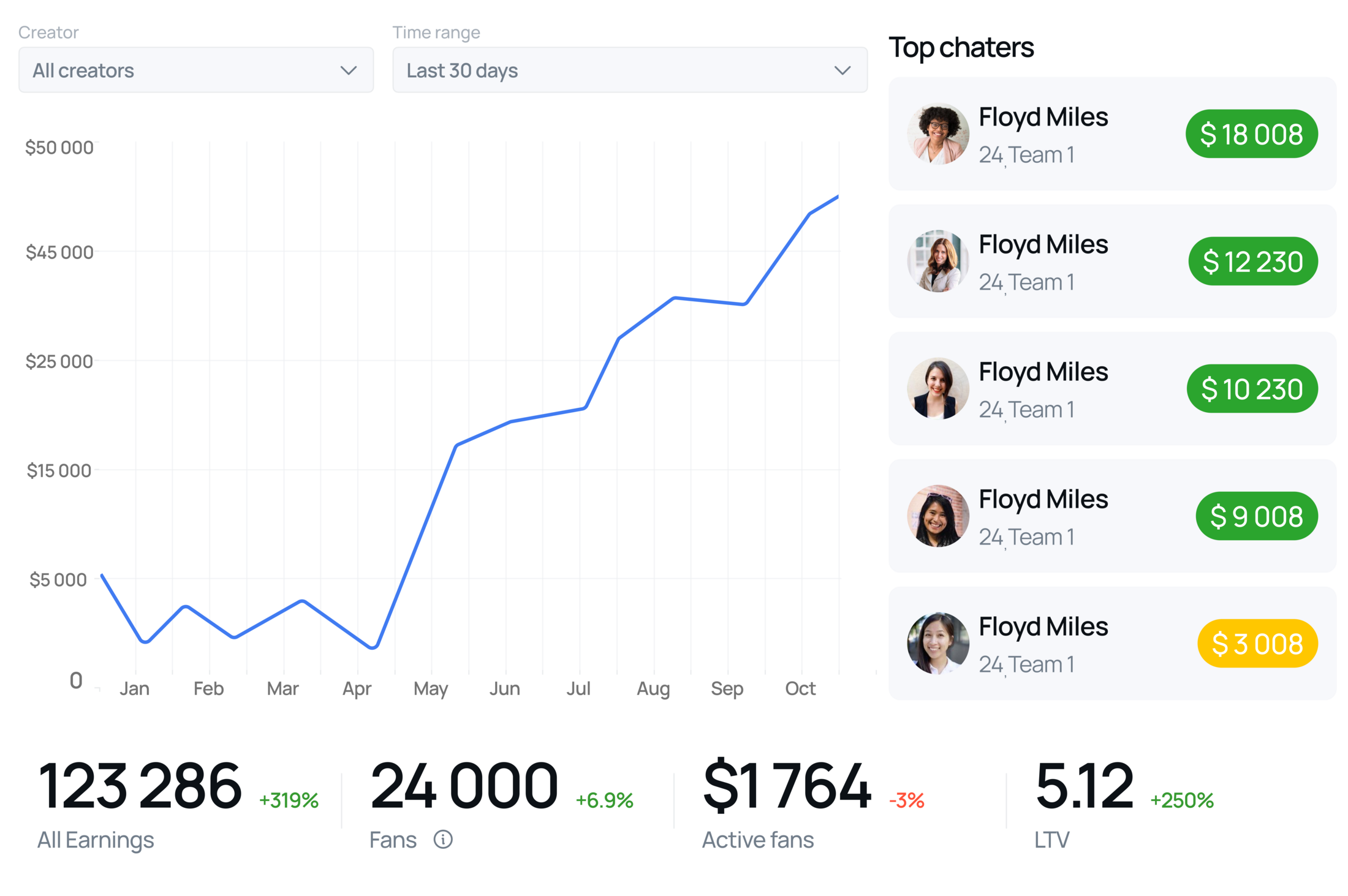 Even though there is limited information on the OnlyFans creator dashboard, Fans-CRM provides the most advanced OnlyFans Dashboard for creators and agencies. You will be able to see historical changes in your profits, identify your top fans and chatters, and monitor which sources of income are rising or dropping. Additionally, you will have access to data on your top-grossing folders and media. Start enjoying the OnlyFans Dashboard for creators for free from today!
